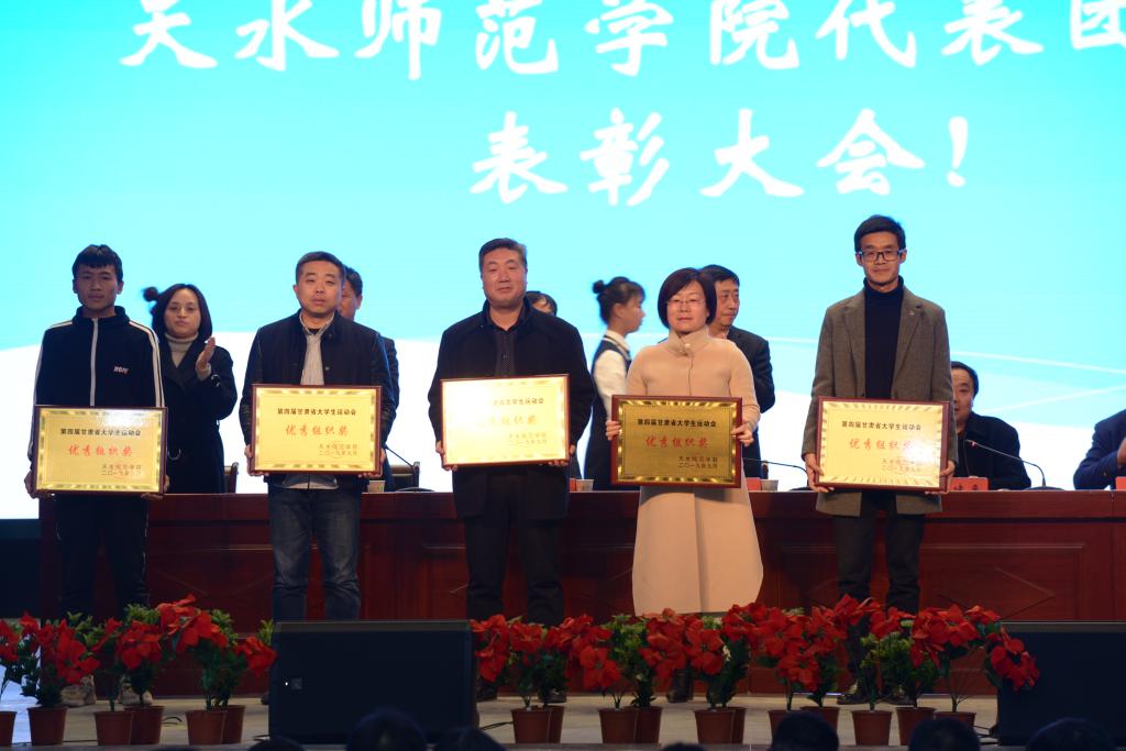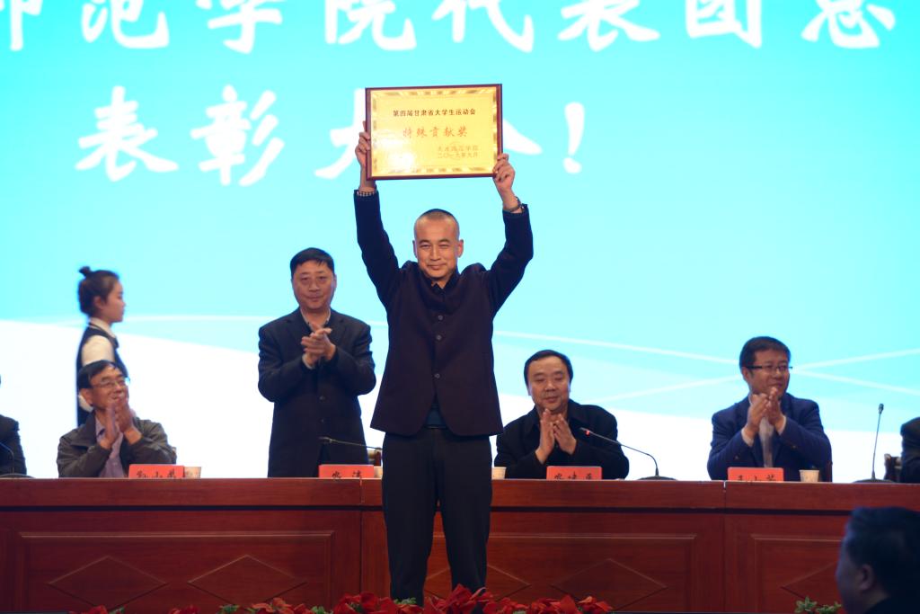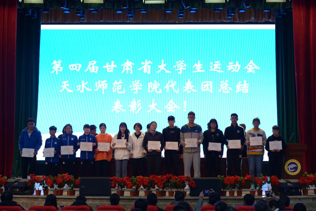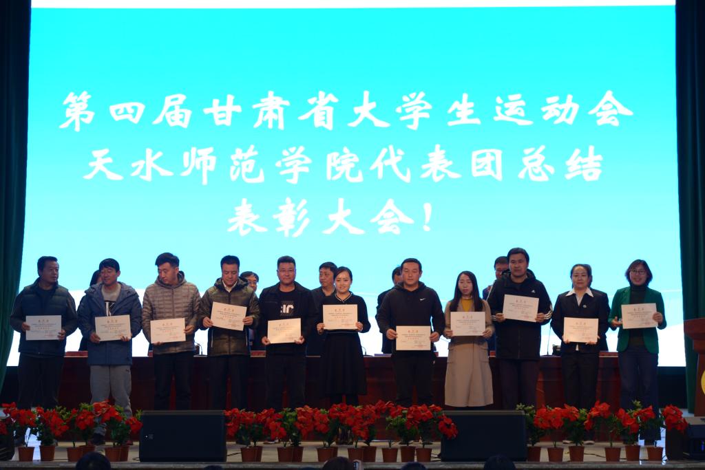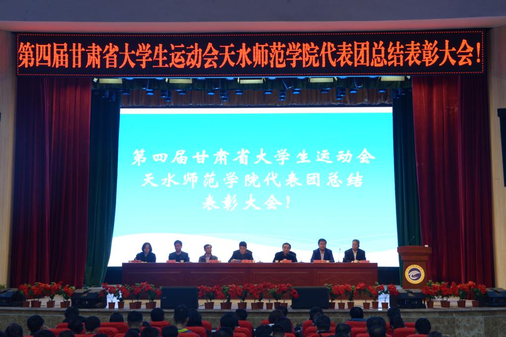 10月14日下午,第四届甘肃省大学生运动会天水师范学院代表团总结表彰大会在学校文化大礼堂召开。学校党委副书记、校长安涛出席会议并为受到表彰的单位和个人进行颁奖。校工会、学生处、团委、二级学院相关负责人,今年会官方网站全体师生和代表团全体运动员、教练员、工作人员共计800余人参加大会。大会由副校长、校体委主任安建平主持。