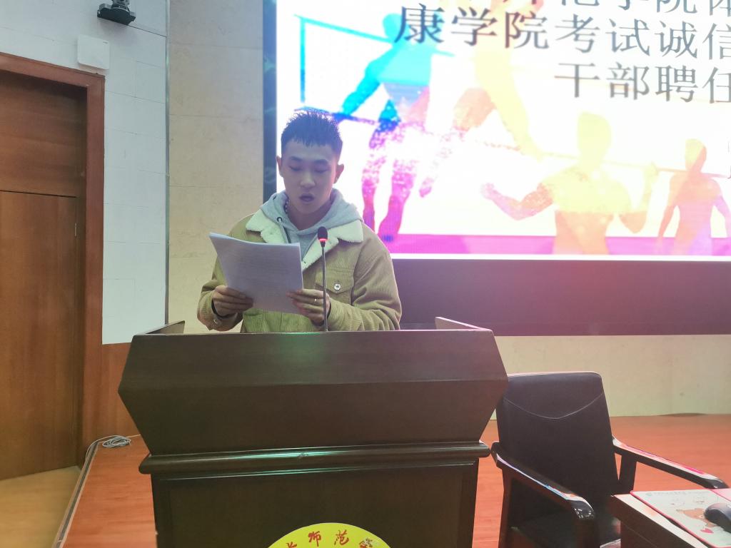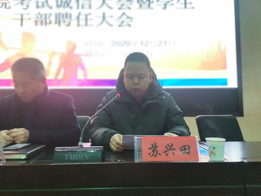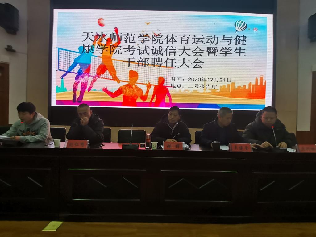 12月21日晚,体育学院在二号报告厅召开考试诚信教育大会暨学生干部聘任大会,学院党政领导班子,各教学系(部)主任,辅导员,19级、20级各班班主任,20级全体学生,以及19级、18级、17级各班学生代表共计370多人参加。大会由学院团委书记王昊支持。