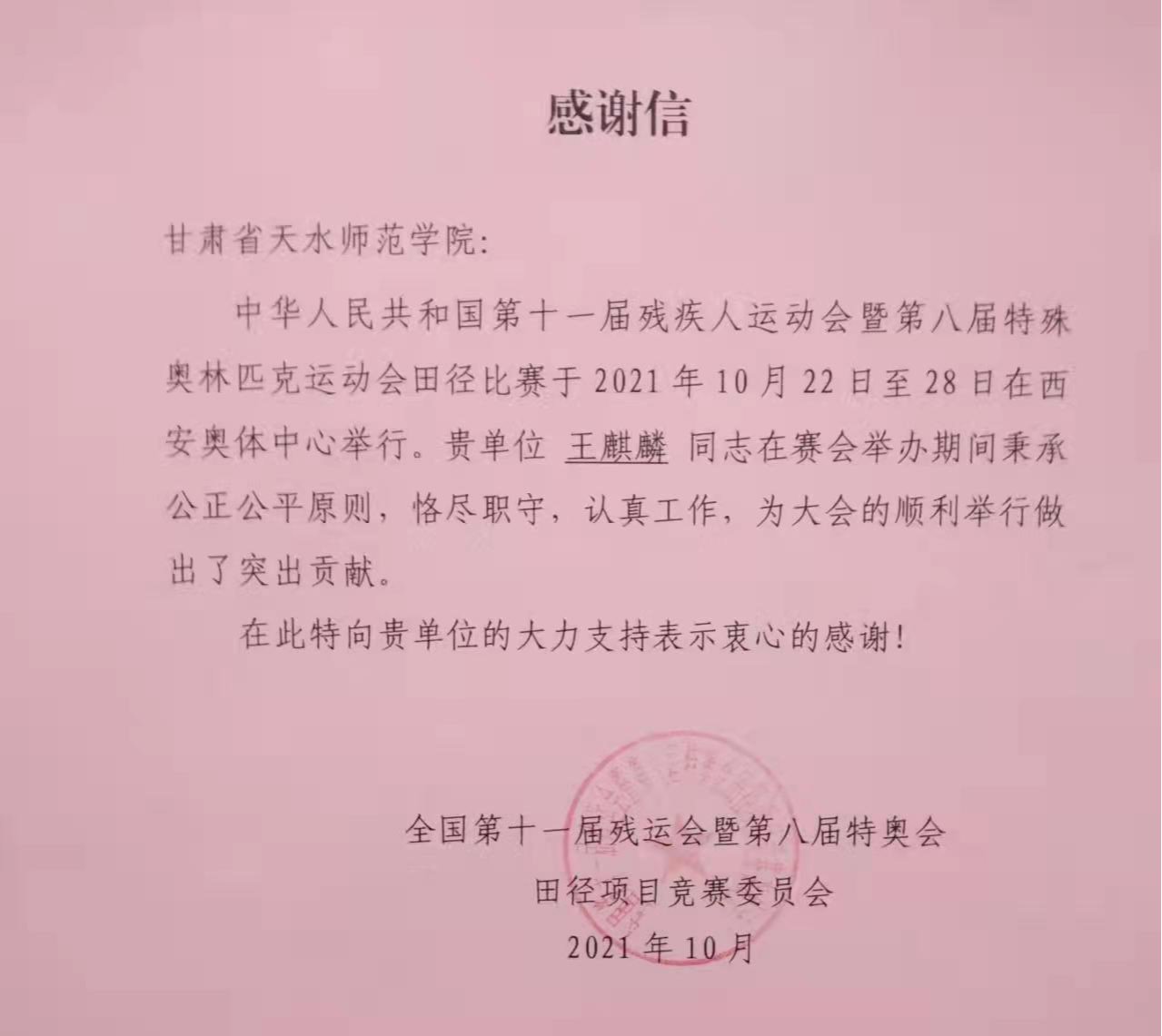 2021年10月22-28日,中华人民共和国第十一届残疾人运动会暨第八届特殊奥林匹克运动会田径比赛在西安奥体中心举行。今年会特奥田径国家级裁判王麒麟教授受中残联和国家体育总局选派为田径项目技术官员,并担任田赛裁判长。