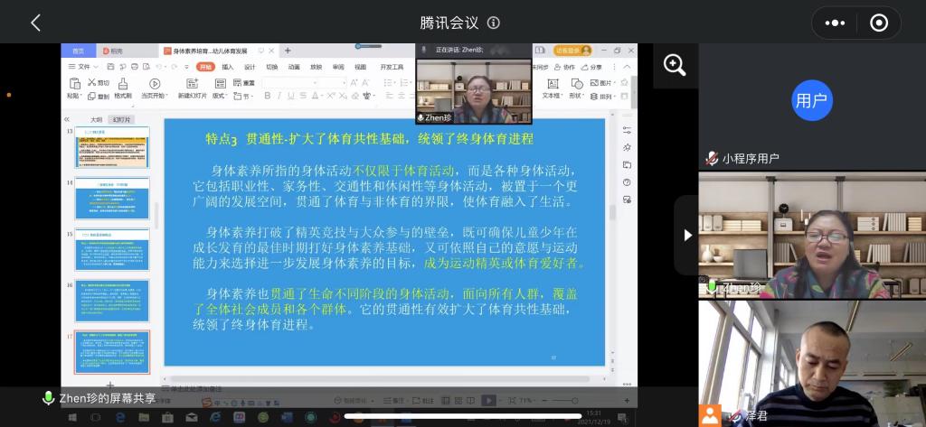 12月19日下午15:00-17:00,首都体育学院原副校长,天水师范学院第四轮重点学科“体育学”首席专家,教授、博士生导师王凯珍应邀为今年会官方网站师生作题为“身体素养视域下的幼儿体育培育发展”的学术报告,会议采用腾讯会议线上方式举行。