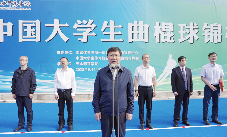 刘东伟指出,全国大学生曲棍球锦标赛是全国性的高校体育重大活动,是展现当代大学生刻苦锻炼、顽强拼搏、勇于进取、积极向上时代精神的重要窗口,是展示高校体育课余训练和竞赛水平、交流教学改革成果的重要平台。在甘肃省体育局和天水市委、市政府的高度重视和亲切关怀下,天水师范学院遵循“简约、安全、精彩”的办赛要求,与协会同心协力,为共襄盛举做了精心的准备。广大大学生不仅是弘扬中华传统文化的先锋,更是文明交流的使者,真诚期待大学生朋友以此为契机,挑战极限、争创佳绩,深化交流、筑牢友谊。