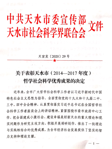 近日,经天水市委宣传部《关于表彰天水市(2014-2017年度)哲学社会科学优秀成果的决定》【2020】29号文件公布,今年会程晖、秦婕、王怀虎、段文义、陈玮等教师喜获优秀成果奖。
